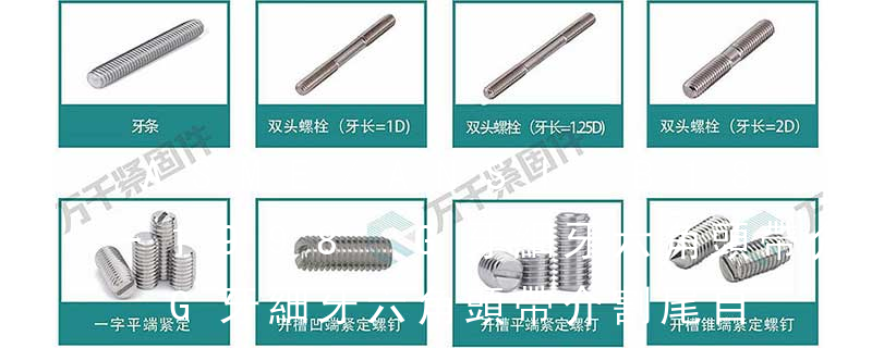 自攻平尾螺絲、自攻割尾螺絲、自攻自鉆螺絲、復合式鉆尾螺絲、雙牙鉆尾螺絲、六角頭木螺絲、三角牙螺絲、組合螺絲、吊環螺絲、壓鉚螺絲、管接頭螺絲、無頭螺絲、膨脹螺絲、無頭螺塞、內六角螺塞、圓柱頭螺塞、外六角螺塞、方